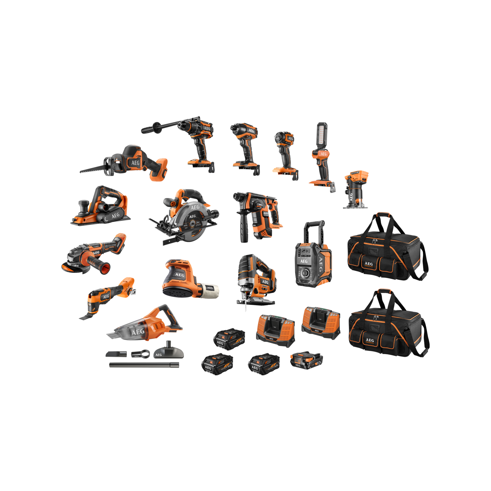 Upgrade or start your professional toolkit with the AEG 18V 6.0Ah 15-Piece FORCE Combo Kit. This Kit provides incredible value and is the largest Kit ever developed by AEG. This Kit includes an 18V FUSION Heavy-Duty Hammer Drill, 18V FUSON 6-Mode Impact Driver Skin, 18V FUSION SDS Plus Rotary Hammer Drill, 18V 125mm FUSION Paddle Switch Angle Grinder, 18V 165mm FUSION Circular Saw Skin, 18V ½” Brushless Impact Wrench, 18V Brushless Multi-Tool, 18V Brushless Sub-Compact Reciprocating Saw, 18V Bru