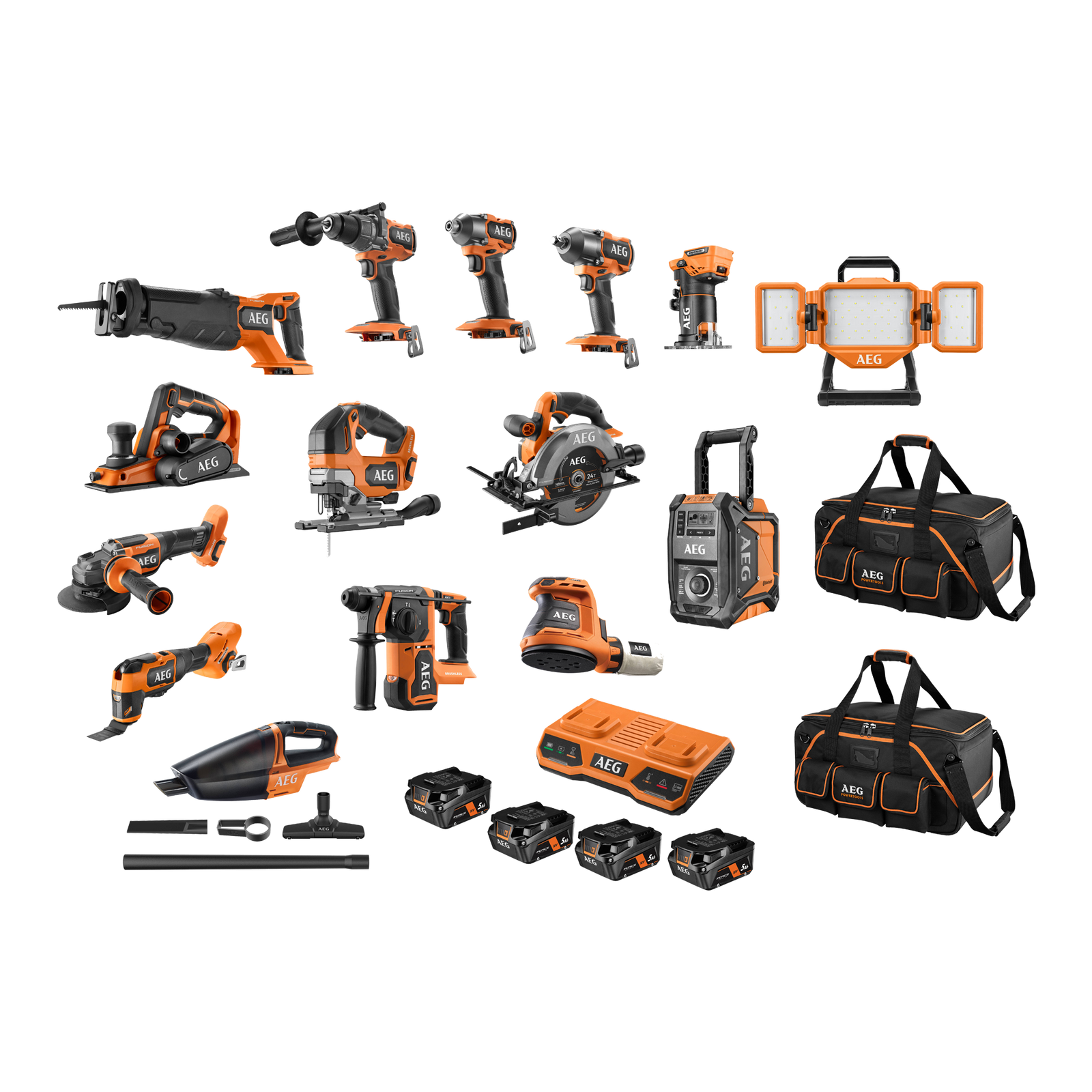 The AEG 18V FUSION/Brushless 15-Piece 5.0Ah FORCE Kit has all the tools, performance and power a tradie needs on any jobsite. This Kit includes seven Gen 2 FUSION brushless tools, four brushless tools and other worksite essentials including a Random Orbital Sander, Dust Extractor, Bluetooth Jobsite Radio, LED Panel Light, 4 x 18V 5.0Ah FORCE Batteries, Dual Port Charger and two AEG Tool Bags to transport everything. Every FUSION tool in this kit harnesses an advanced brushless motor with more