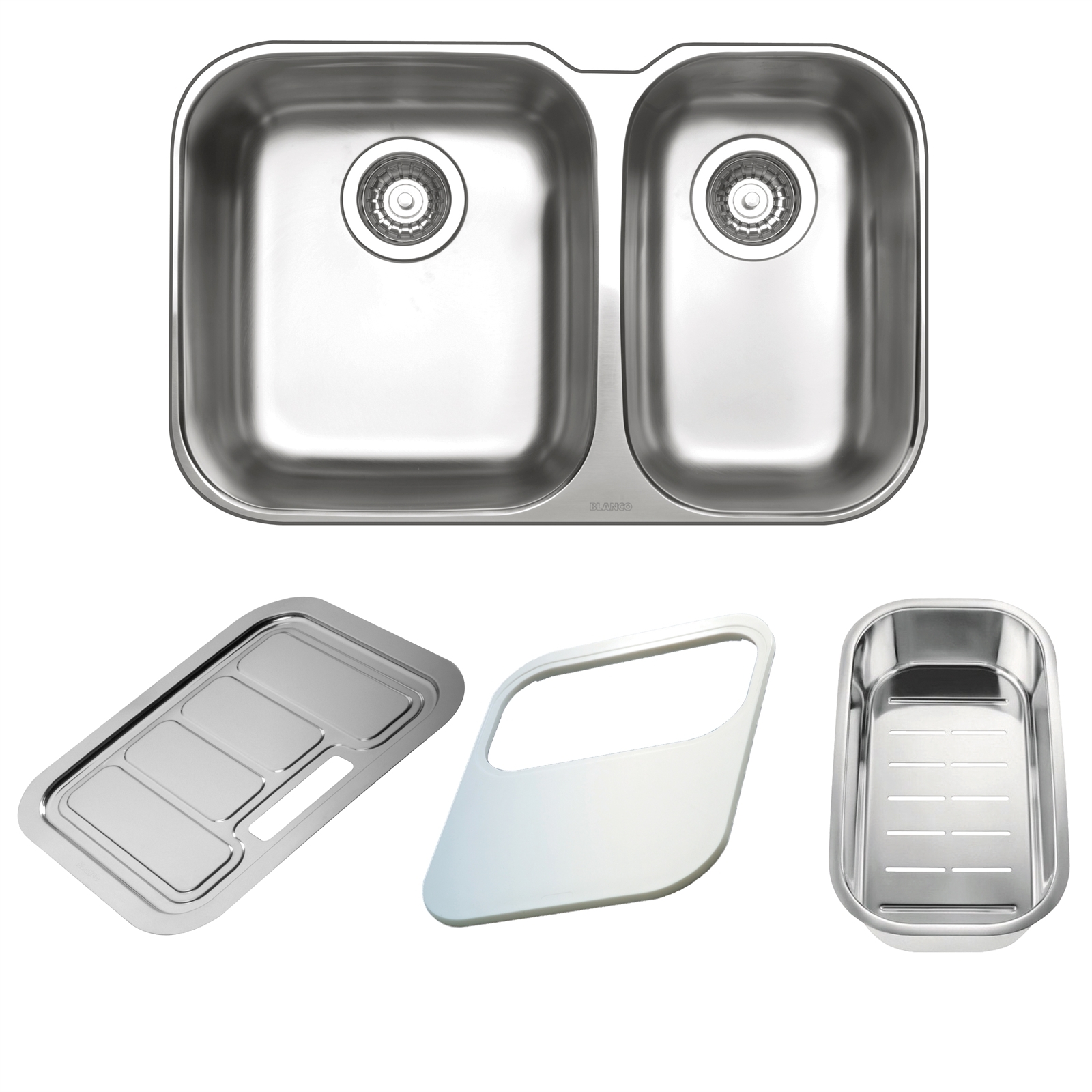 Get all the essentials for your kitchen sink. The Blanco Essential Undermount sink features a roomy bowl with stainless steel finish. And to complement your new sink, you'll also receive a plastic cutting board, colander and draining tray.