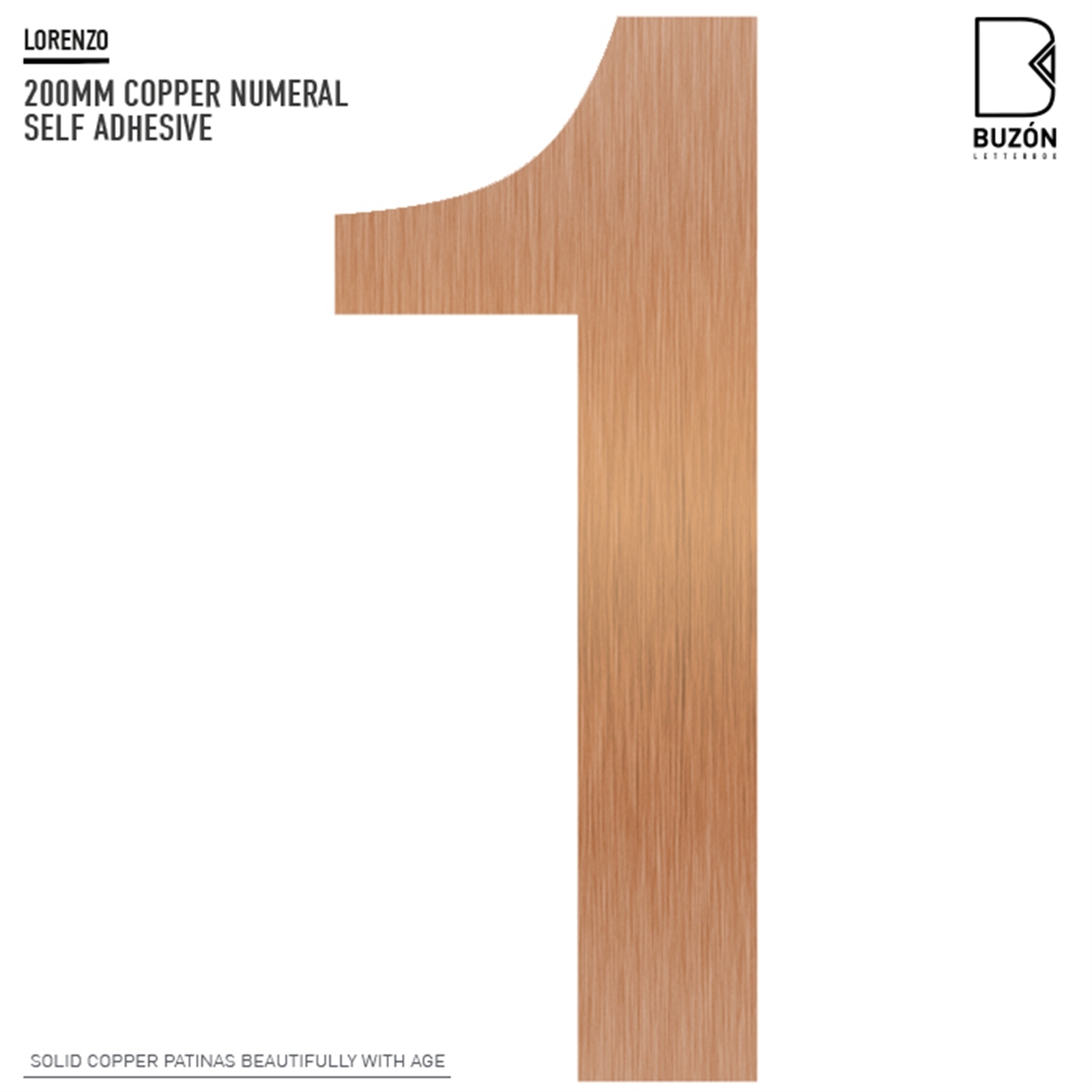 The Buzon range of Lorenzo Copper Numerals features superb 2mm thick Copper which Patinas beautifully with age. Super strong 3M tm Adhesive makes Installation to any surface easy.