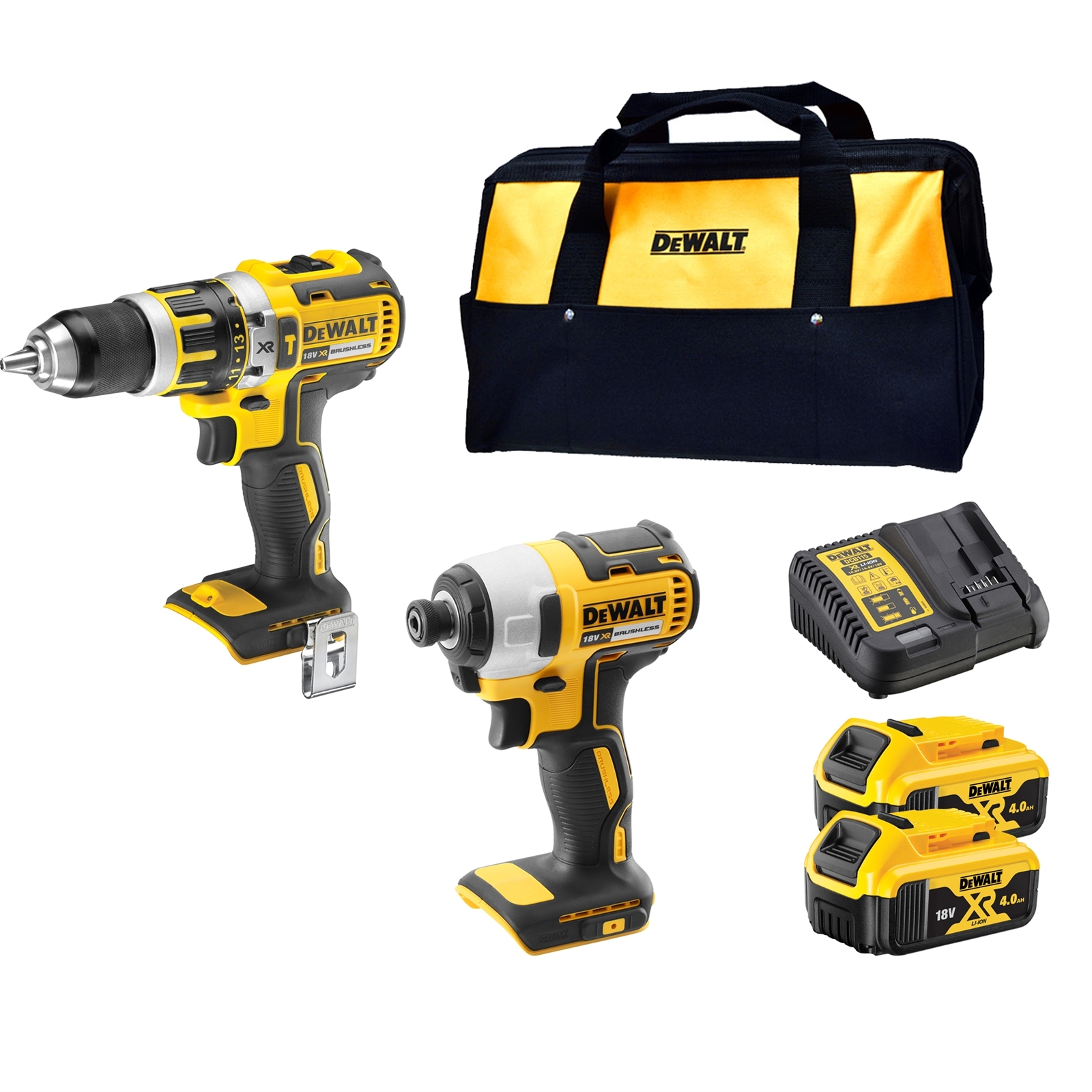 Includes: DCD795 18V XR Li-Ion BRUSHLESS 2 Speed Hammer Drill/Driver, DCF787 18V XR Li-Ion BRUSHLESS Impact Driver 170Nm Torque, 2 x 4.0Ah Li-Ion Batteries, Multi-Voltage Charger, DEWALT Contractor Bag.