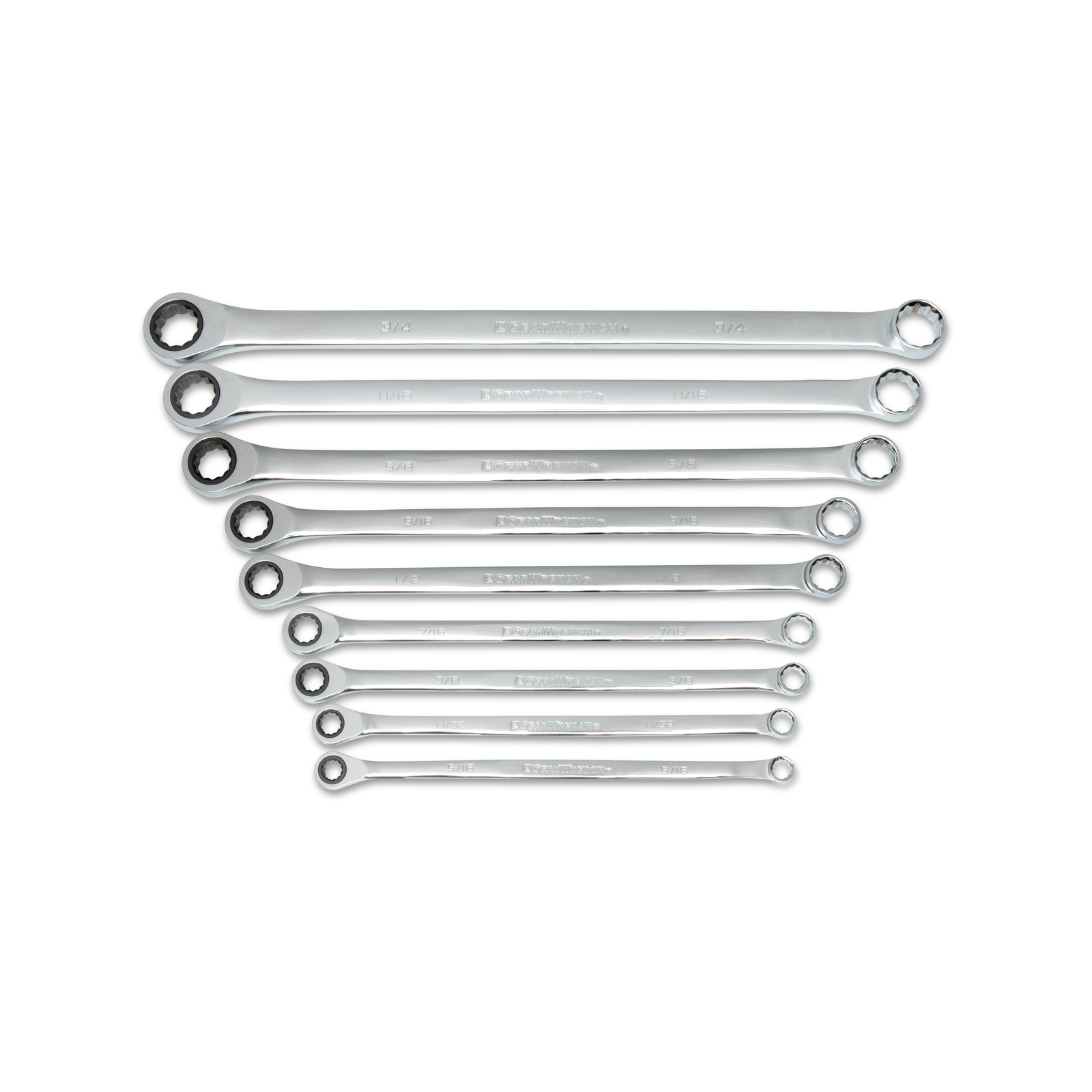 GEARWRENCH 85998 9-piece XL Gear Box Double Box End SAE ratcheting wrench set consists of 1 of each 5/16", 11/32", 3/8", 7/16", 1/2", 9/16", 5/8", 11/16" and 3/4" XL gear box ratcheting wrenches. Ratcheting box end need as little as 5-Degrees to move the fastener as opposed to 30 degrees for standard box end wrenches. The standard box end combined with the long pattern length gives this wrench excellent torque capabilities to break a stubborn, rusted fastener. The ratcheting box end then makes t