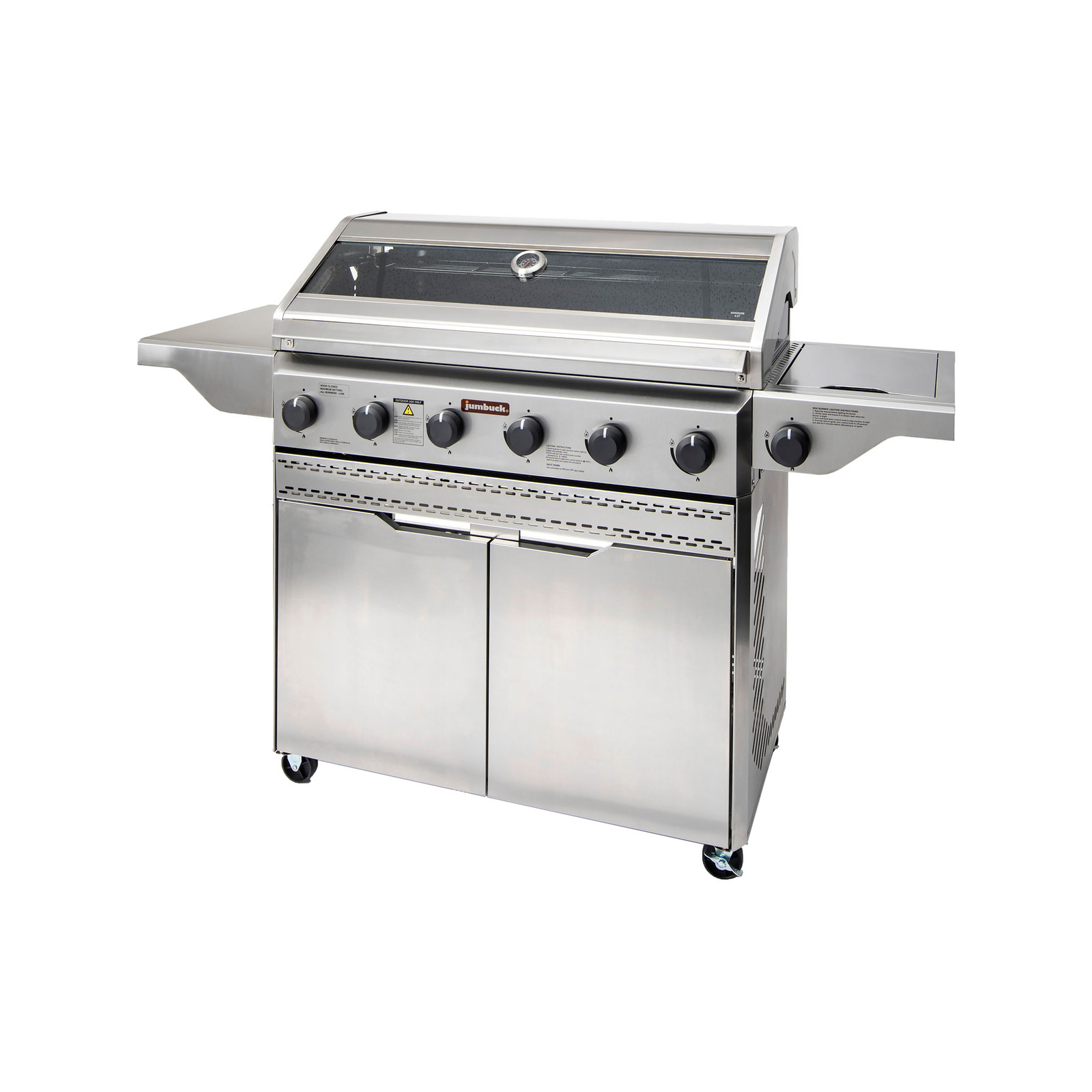 The Jumbuck Astro 6 Burner BBQ features 430 grade stainless steel construction, a huge glass viewing window in the roasting hood, front removable grease tray, side burner and cast iron hotplate and cooking grill. Offering gas bottle storage and hose and regulator.