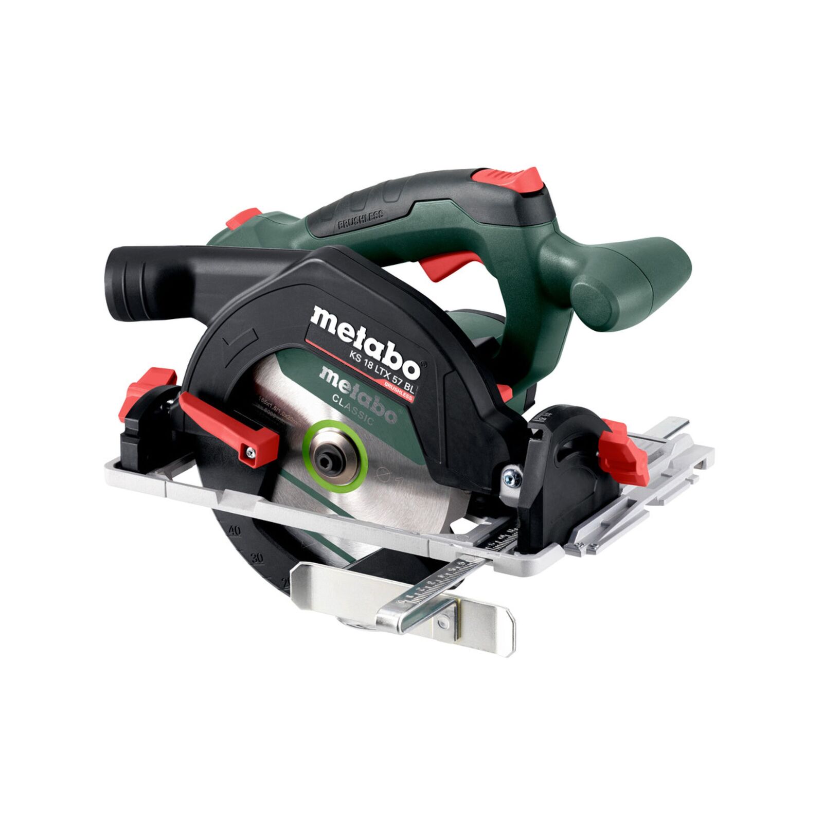Metabo 18V Brushless 57mm Circular Saw Skin Only 611857850 Features: The Metabo KS 18 LTX 57 BL is Fast, precise cross cuts thanks to easy coupling with a Metabo cross cutting rail Automatic switching on/off of the connected vacuum cleaner thanks to CordlessControl. (available as accessory) + Fast brake stops the saw blade quickly and improves safety Accurately angled bevel cuts down to 50°, with handy snap-in point at 45° 0° position re-adjustable for highest cutting precision Clearly visibl