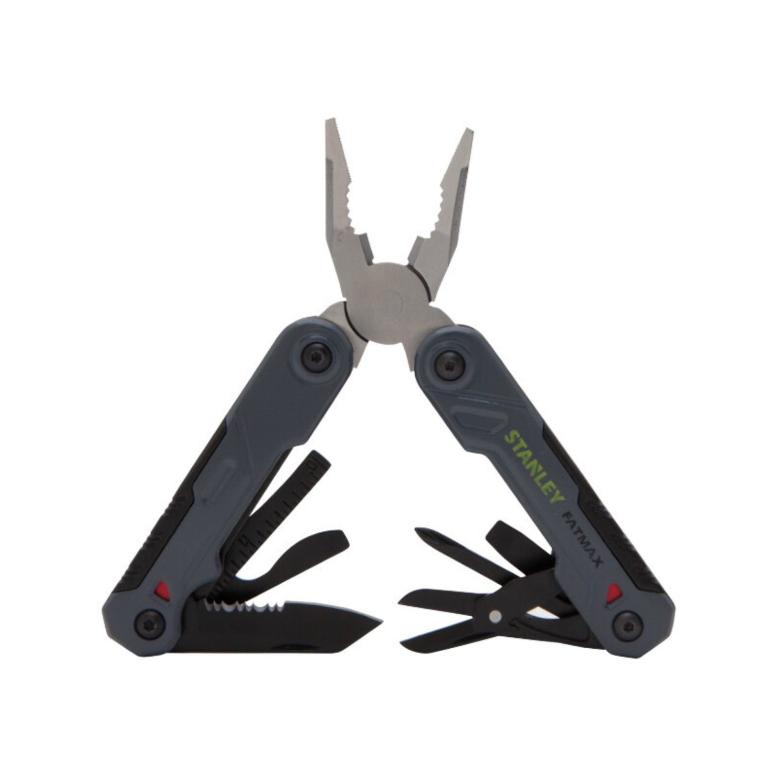 The Stanley Fatmax 16-in-1 Multi Tool includes Spring Loaded Pliers, Spring Loaded Needle Nose Pliers, Spring Loaded Wire Cutter, Knife Blade, Serrated Knife Blade, Scissors, Wood/Metal File, Wire Stripper, Phillips® Screwdriver, Small Screwdriver, Medium Screwdriver, Large Screwdriver, Fold-Out Carabineer/Lanyard Hole, Ruler, Bottle Opener, Can Opener.