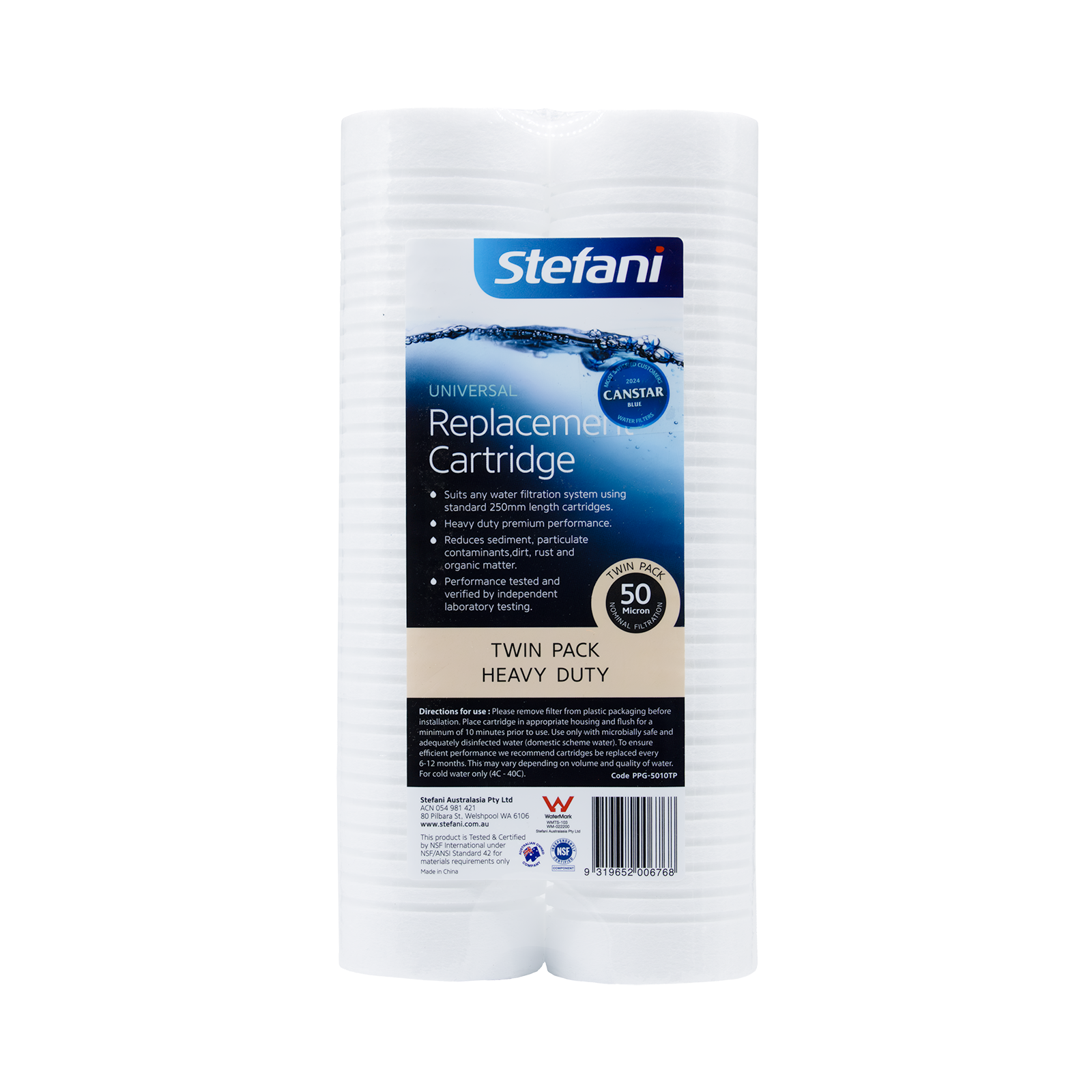Stefani 50 Micron Heavy Duty Universal Replacement Cartridge Twin Pack suits all Stefani Under-Sink Systems that take 250mm cartridge (single, double, triple and reverse osmosis). In addition, the cartridge will fit Stefani On-Bench Digipure Systems. Replacement cartridge not only integrates with Stefani but can also fit filtration system's using standard 250mm filter cartridges. Enjoy the taste, convenience and health benefits of filtering your own drinking water, at a fraction of the cost fo